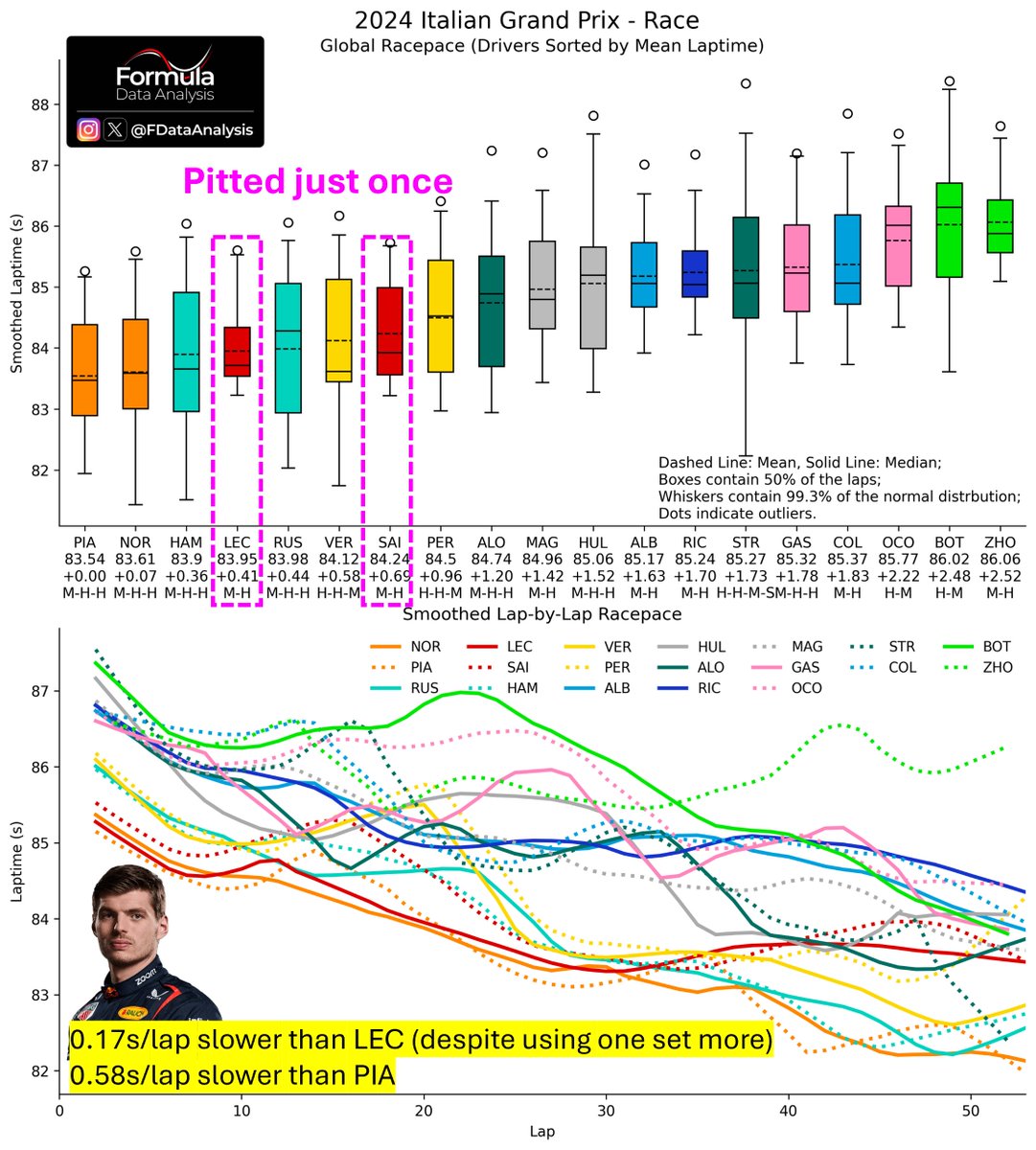 Op de onboardbeelden van de Canadees is te zien dat hij meteen aan de kant gaat voor Piastri, maar dat hij een beetje aan de buitenkant van Variante Ascari blijft hangen. Hierdoor kan de McLaren-coureur niet de ideale racelijn nemen en rijdt hij - zo blijkt uit de tijdenlijst - ook zijn langzaamste ronde vanaf het moment dat hij Sainz had ingehaald voor P2 in de race. In de laatste sector verloor hij uiteindelijk vier à vijf tienden in vergelijking met eerdere ronden.