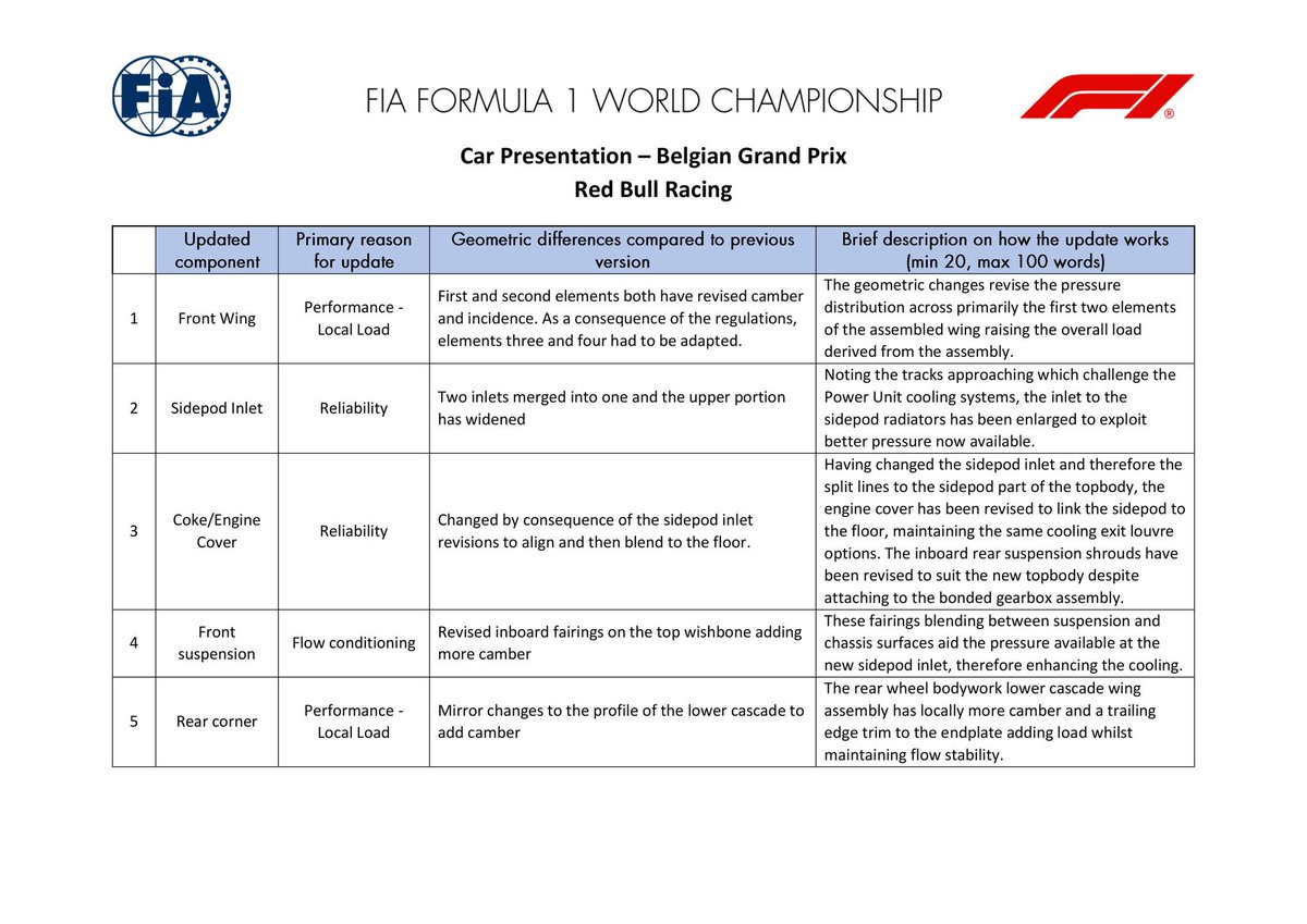 Uit de documenten van de FIA blijkt namelijk dat ze meerdere nieuwe onderdelen meenemen naar het circuit in de Belgische Ardennen. Red Bull introduceert dit weekend een nieuwe voorvleugel, waarbij het eerste en het tweede element zijn aangepast. Ook de sidepod inlet is aangepast, maar dit heeft meer te maken met de betrouwbaarheid.