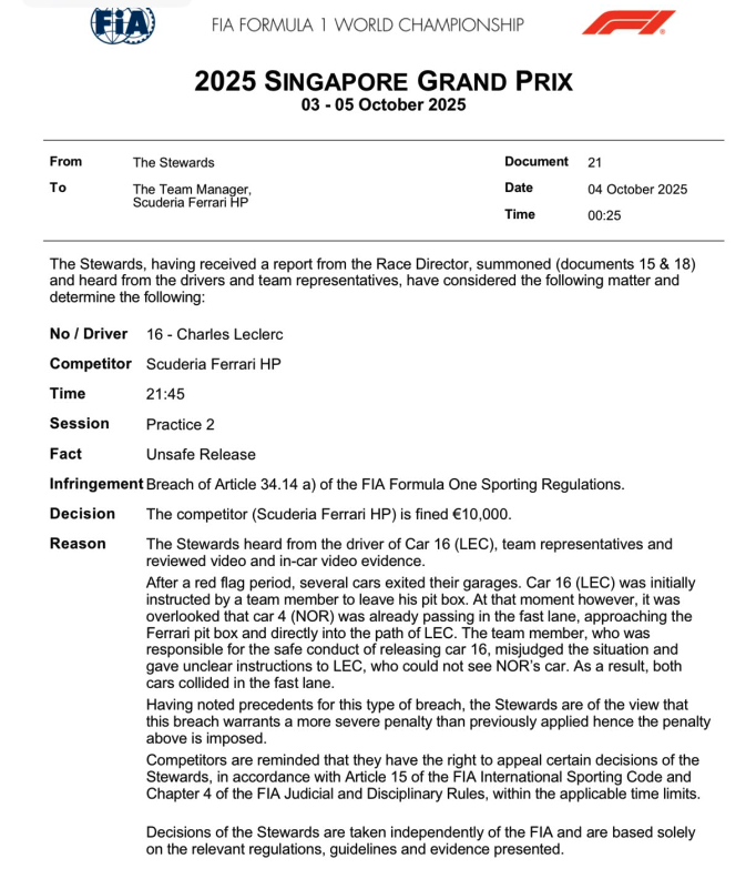 De FIA besloot om Leclerc geen gridstraf, maar een boete voor het team uit te delen. “Na de rode vlag verlieten meerdere auto’s de garages. Leclerc kreeg de instructie van een teamlid om zijn pitbox te verlaten. Dit teamlid had echter de auto van Norris over het hoofd gezien. Die reed al in de 'fast lane' en kruiste het pad van Leclerc”, zo luidde het document van de FIA.